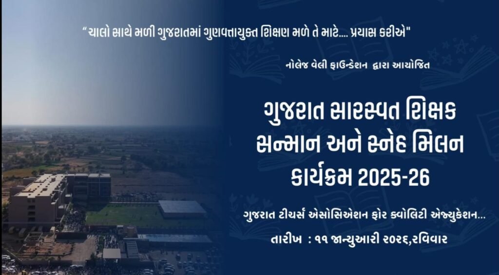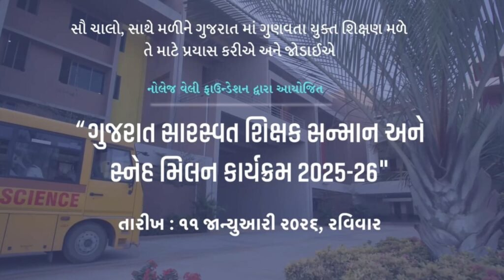 ગુજરાત રાજ્યમાં શિક્ષણ ક્ષેત્રે ઉત્કૃષ્ટ કાર્ય કરનાર શિક્ષકોને માન્યતા આપવી અને તેમને ઉત્સાહિત કરવા એ હેતુસર “ગુજરાત સારસ્વત સન્માન” કાર્યક્રમનું આયોજન કરવામાં આવે છે.આ વર્ષે નોલેજ વેલી ફાઉન્ડેશનઅને ધ સ્કૂલ ઓફ સાયન્સ (SOS)દ્વારા કાર્યક્રમ આયોજિત કરવામાં આવી રહ્યો છે. કાર્યક્રમનો મુખ્ય ઉદ્દેશ શિક્ષણ ક્ષેત્રે ઉમદા કામગીરી કરનાર શિક્ષકોને જાહેર મંચ પર સન્માનિત કરીને તેમના યોગદાનને માન્યતા આપવાનો છે. શિક્ષણક્ષેત્રે નોંધપાત્ર યોગદાન આપનાર, વિદ્યાર્થીઓના સર્વાંગી વિકાસમાં સહભાગી બનનાર તથા આધુનિક શિક્ષણ પદ્ધતિઓ અમલમાં મુકનાર શિક્ષકોને આ સન્માન માટે પસંદ કરવામાં આવશે.શિક્ષક માત્ર જ્ઞાન આપનાર નહિ, પરંતુ સમાજનું ઘડતર કરનાર હોય છે. તેથી તેમનું સન્માન અને પ્રોત્સાહન આપવું અત્યંત જરૂરી છે. આ કાર્યક્રમ શિક્ષકોના મૂલ્યવાન પ્રયાસોને ઓળખી તેમનું આદરપૂર્વક સન્માન કરી રહ્યું છે, જેનાથી તેમને નવી પ્રેરણા મળે છે અને અન્ય શિક્ષકો માટે પણ આ કાર્યક્રમ એક પ્રેરણારૂપ બની રહેશે. સમગ્ર શિક્ષણ વ્યવસ્થાપનમાં તેમજ ગુણવત્તા અને જવાબદારીમાં વધારો થાય છે.
